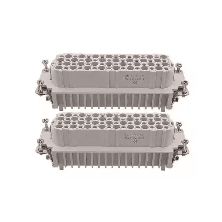 Combining two HD-064-FC units, this connector operates in extreme temperatures (-40℃–125℃) with 4kV impulse protection and ≤3mΩ resistance. It is ideal for photovoltaic and construction systems, ensuring 7.5Nm torque stability and 500+ mating cycles.
