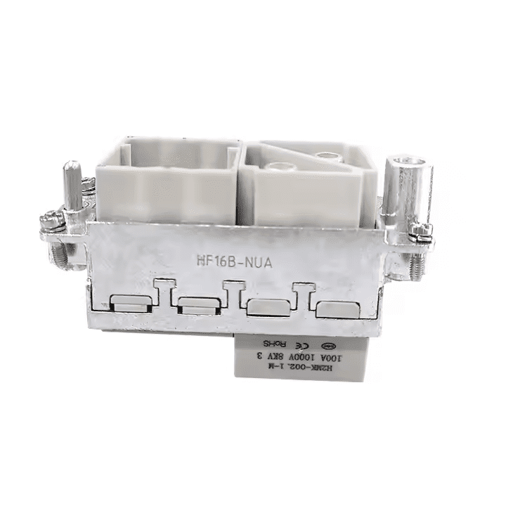 The HF16B-NUA hinged frame accommodates four HM-series modules within Han 16B hoods and housings, facilitating hybrid 4-10mm² (AWG12-8) power and 1-2.5mm² (AWG18-14) signal integration. Zinc alloy construction guarantees stability across -40℃–125℃ extremes.