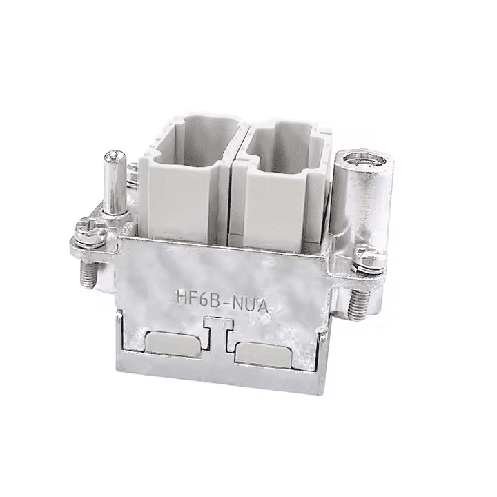 The HF6B-NUA hinged frame (HM series) integrates two modules within Han 6B Hoods and housings, supporting 4-10mm² (AWG12-8) power and 1-2.5mm² (AWG18-14) signal wires. Zinc alloy construction ensures durability across -40℃–125℃ with ≥500 mating cycles.