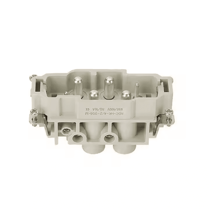 The HK-004/2-M heavy duty insert combining power (80A) and signal (16A) channels in one insert, this connector operates from -40℃–125℃ with 500+ mating cycles. Ideal for harsh environments in construction machinery and energy systems, compatible with H16B shells. Custom OEM solutions available.
